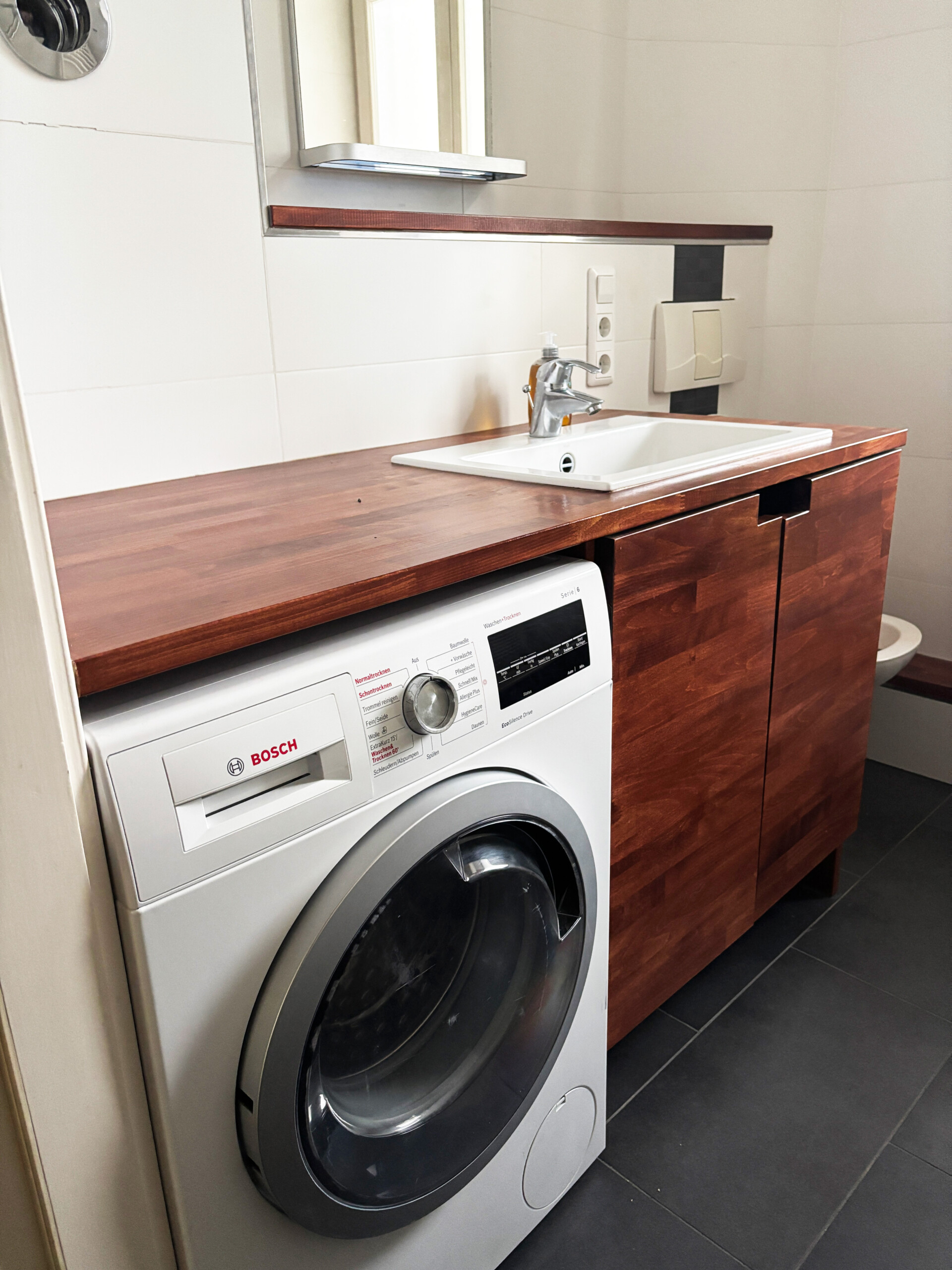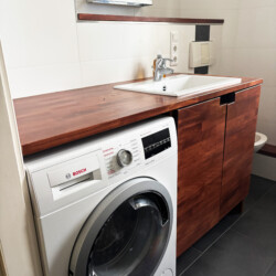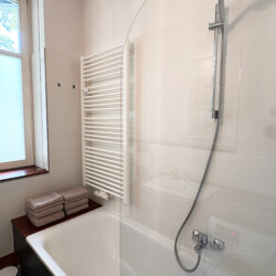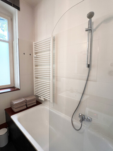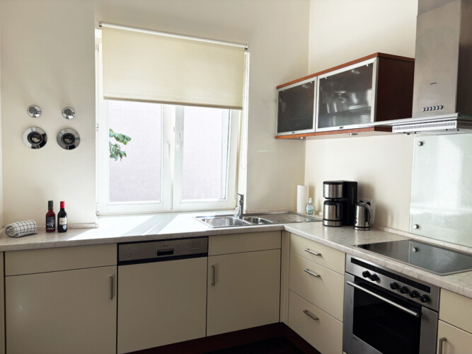 The apartment also includes a modern bathroom with warm wooden accents, a bathtub, and a washer/dryer. The fully equipped kitchen has everything you need for daily living and cooking, and a sunny balcony overlooking the quiet courtyard offers a peaceful spot to relax outdoors.