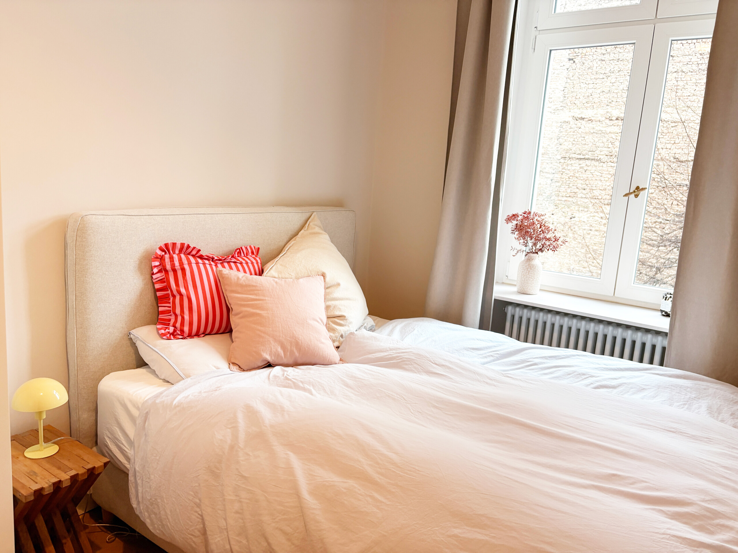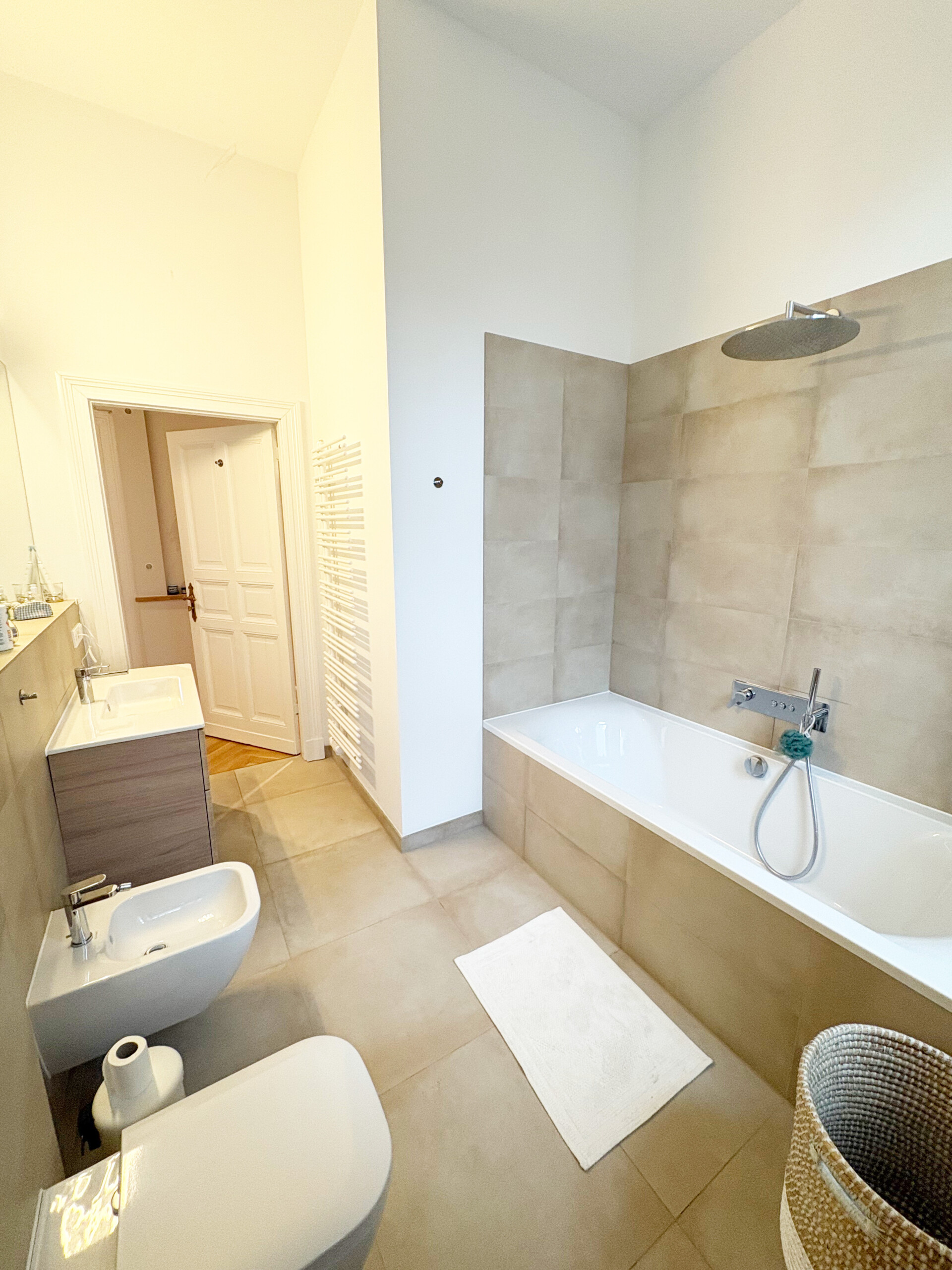 This charming and bright first-floor apartment offers 88 sqm of comfortable living space, featuring three rooms. Living room and dining room are connected by huge wing doors, also there is a cozy bedroom with a queen-size bed (sited towards the quiet yard), a fully equipped kitchen, a huge, modern bathroom with a tub and rain shower, and a sunny balcony perfect for relaxing or enjoying a morning coffee. Ideal for anyone seeking an inviting and friendly home.