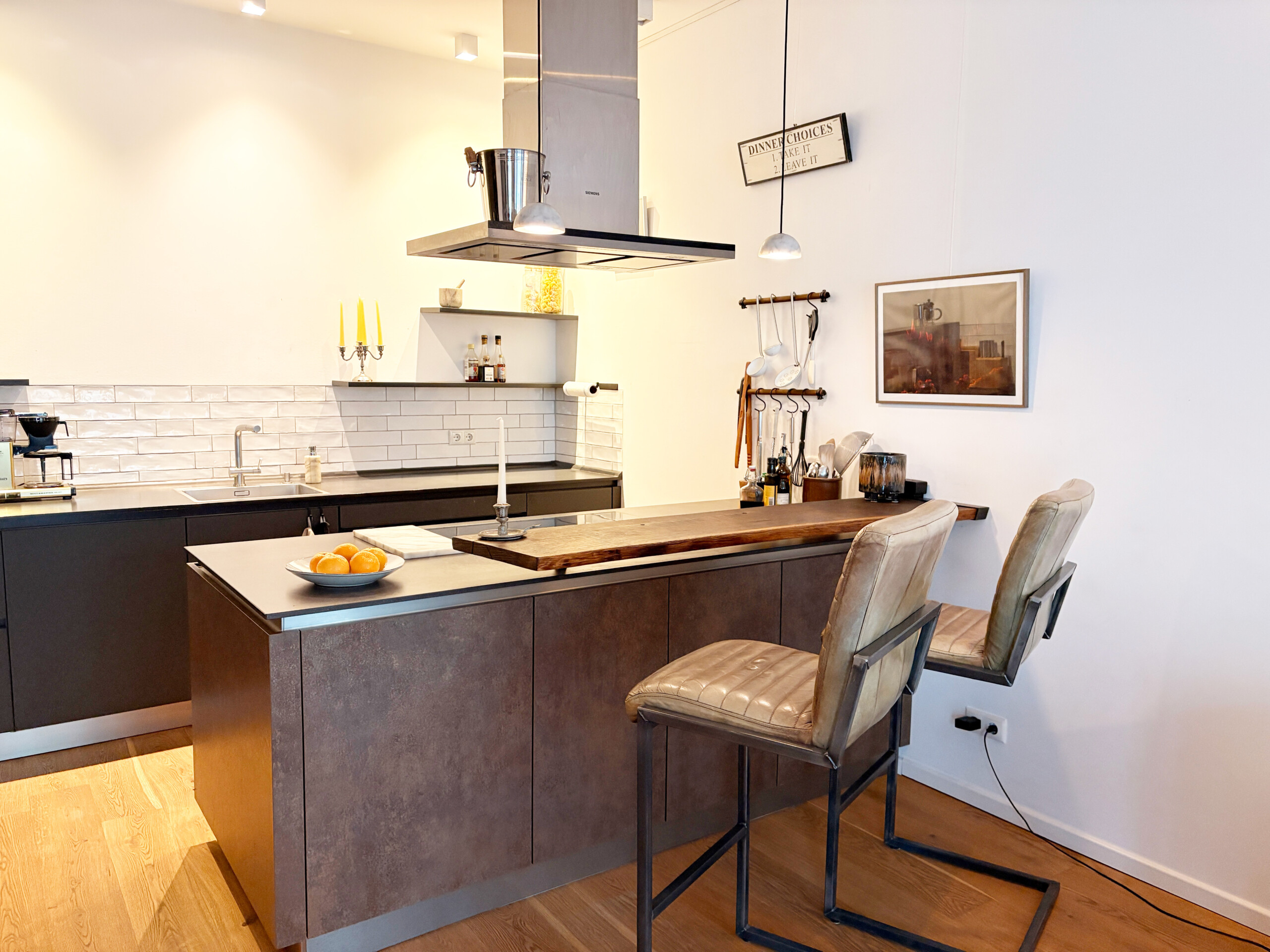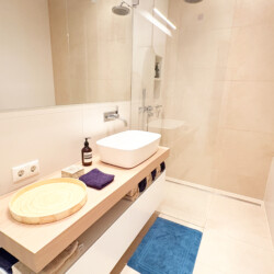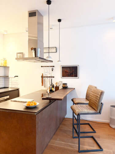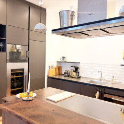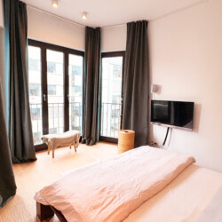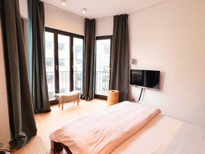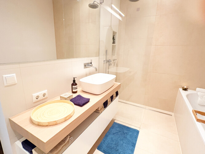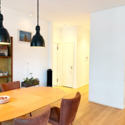 This bright and spacious 81 m² apartment is located on the 3rd floor and accessible by elevator. It features high 3 m ceilings, floor-to-ceiling windows, underfloor heating, and beautiful wooden floors throughout. The open-plan living, dining, and kitchen area creates a generous sense of space, complemented by a fully equipped designer kitchen with high-quality appliances and a custom-made oak bar table. The apartment also offers a separate toilet, a stylish bathroom with a walk-in rain shower and a large bathtub, a washer-dryer, and a comfortable bedroom with a king-size bed and a walk-in closet. All rooms provide direct access to a private balcony.