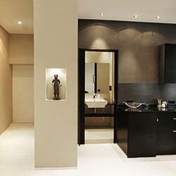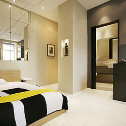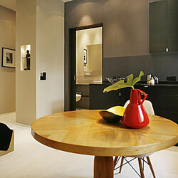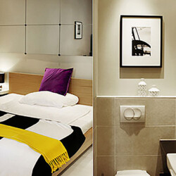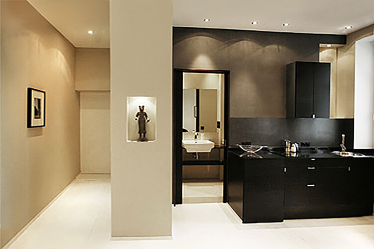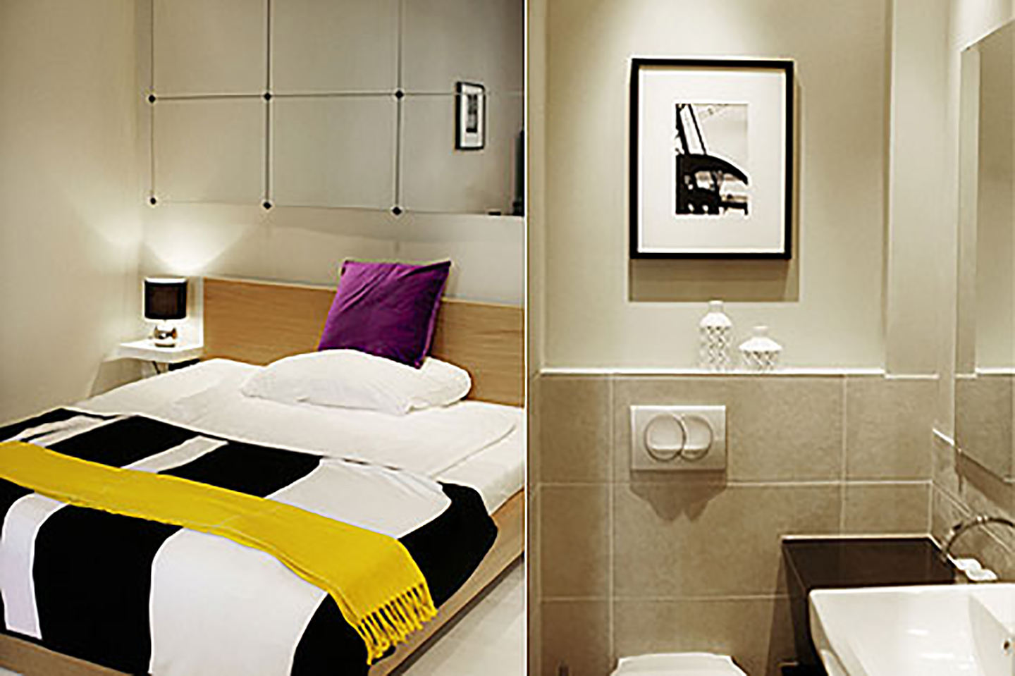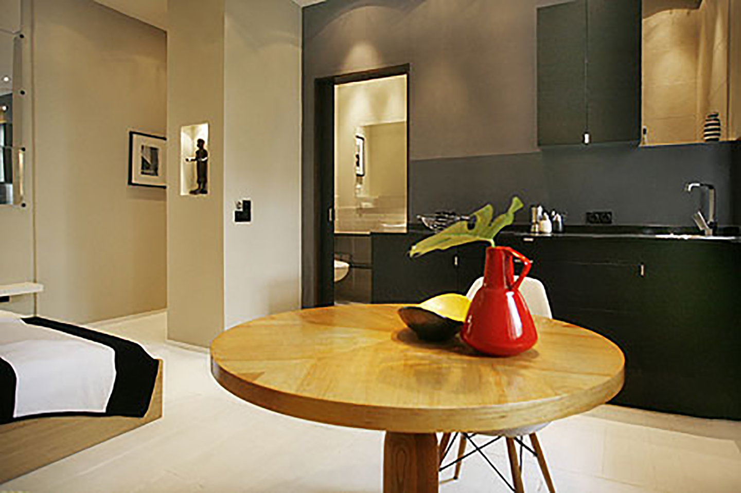 This stylish designer studio apartment is suitable for one single person as well for couples who like to enjoy being central but although in a very quiet street. The modern studio feels very spacious and a well thought through efficient floor plan gives the small but convenient studio apartment a great comfortable open space equipped with all needs featuring designer furniture. The modern open plan kitchen scheme has clean lines, handleless cabinets kept in darkish, cool but warm colors combined with modern appliances all the way through and connects the kitchen space with the living room perfectly. The queen size bed invites for peaceful sleeps. The bathroom is equipped with high quality fittings and tiling. Highlights include the square wash basin and walk in rain shower. This apartment is ideal for urban singles or couples who love to enjoy the city right in front of their door step.