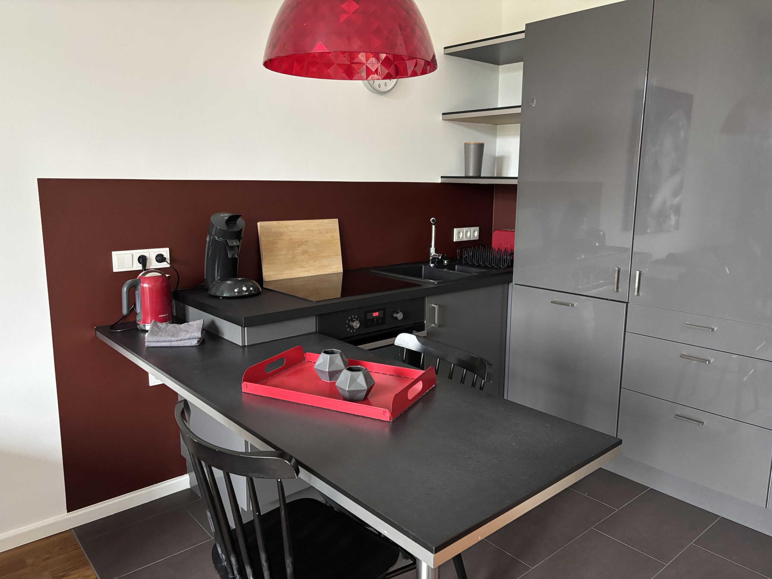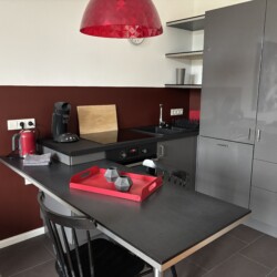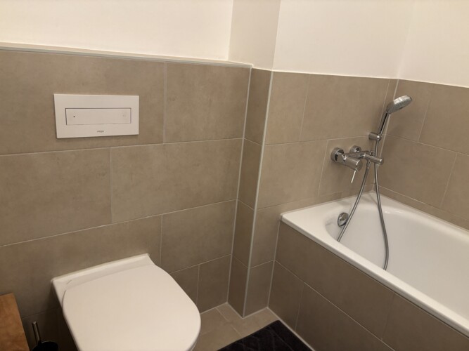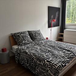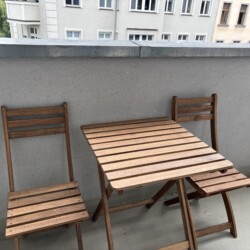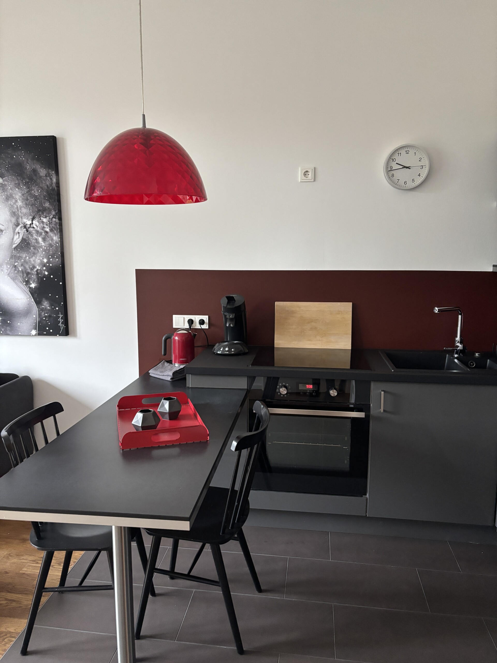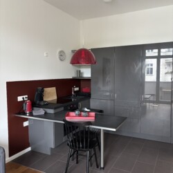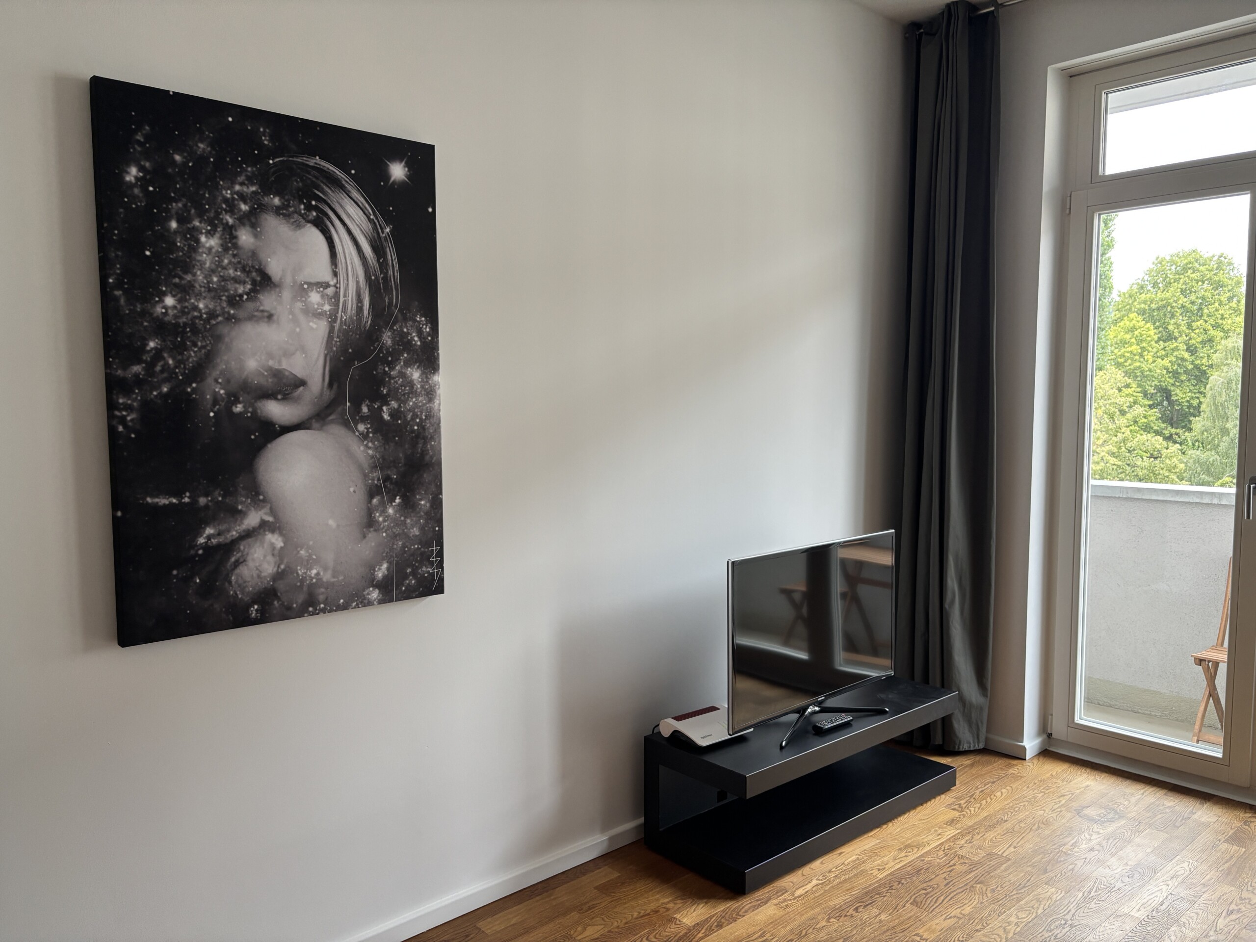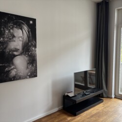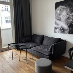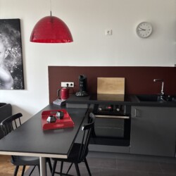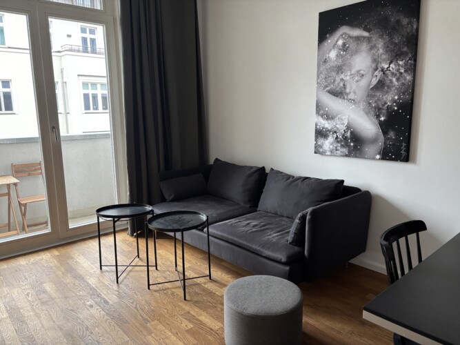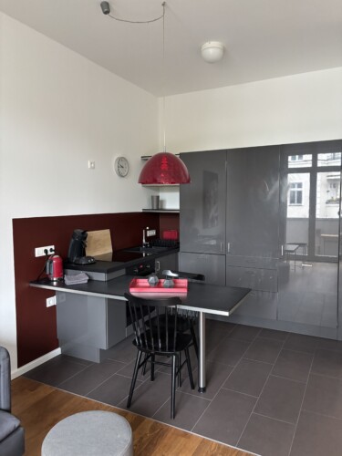 As you enter the charming grand Foyer of the modernised 60`s building assemble you can reach the Apartment by lift on the 3rd floor. The modern one bedroom apartment has a balcony with fantastic views including the TV tower. The living space combines perfectly with the fully equipped open plan kitchen. Beautifully decorated with attention to detail and large arty pictures on the walls. The custom made kitchen features modern appliances and built in cabinets with shiny surfaces. The sofa can be transferred into a bed and can comfortably fit two more persons. The bedroom features a queen size bed for a peaceful sleep including a large cupboards and great views from the windows. There are two bathrooms – one includes a bath tub and the second a walk-in rain shower. In the beautiful shared courtyard everybody is welcome to use the spacious children’s playground and a ping pong table for friends and kids.