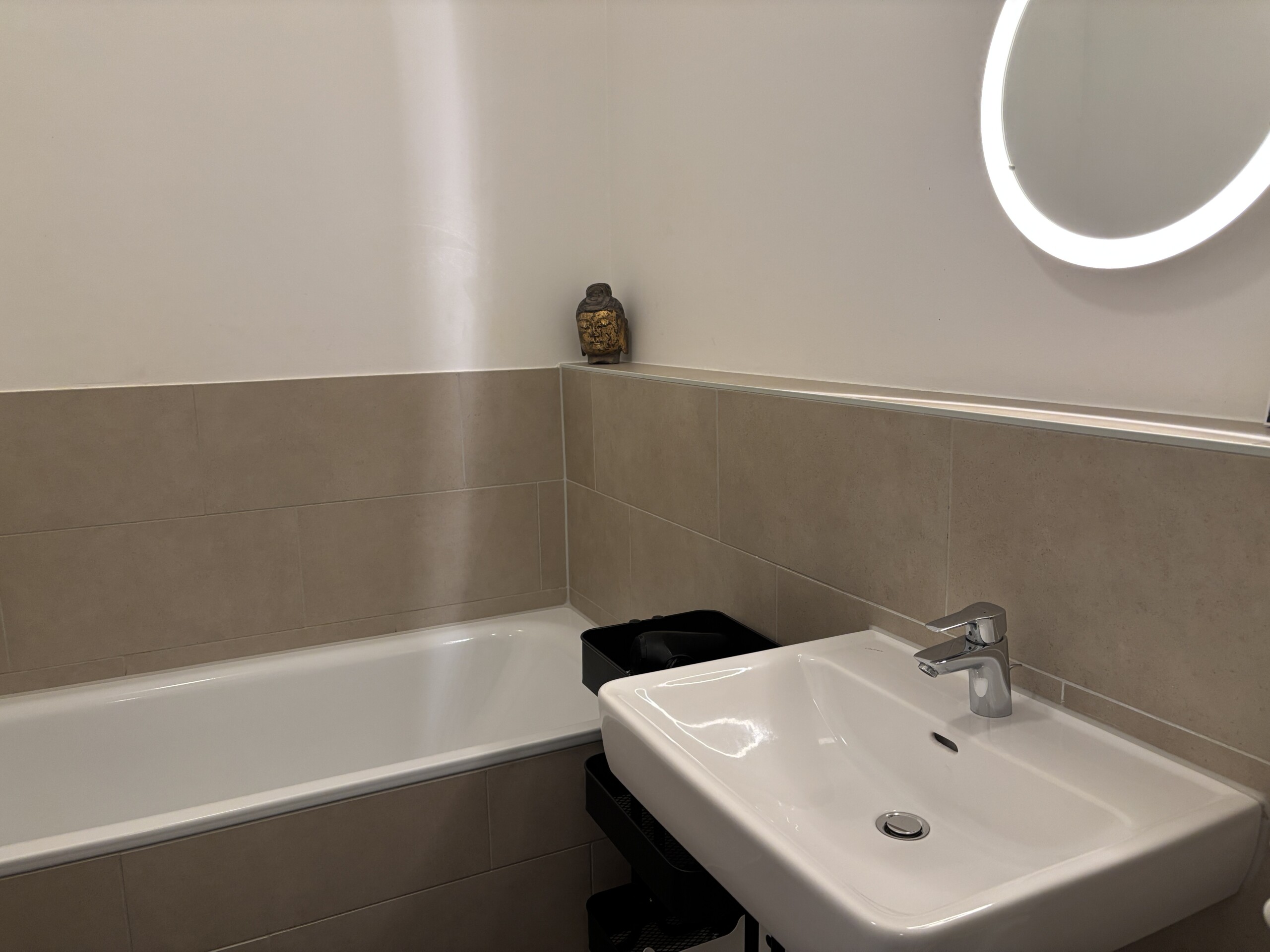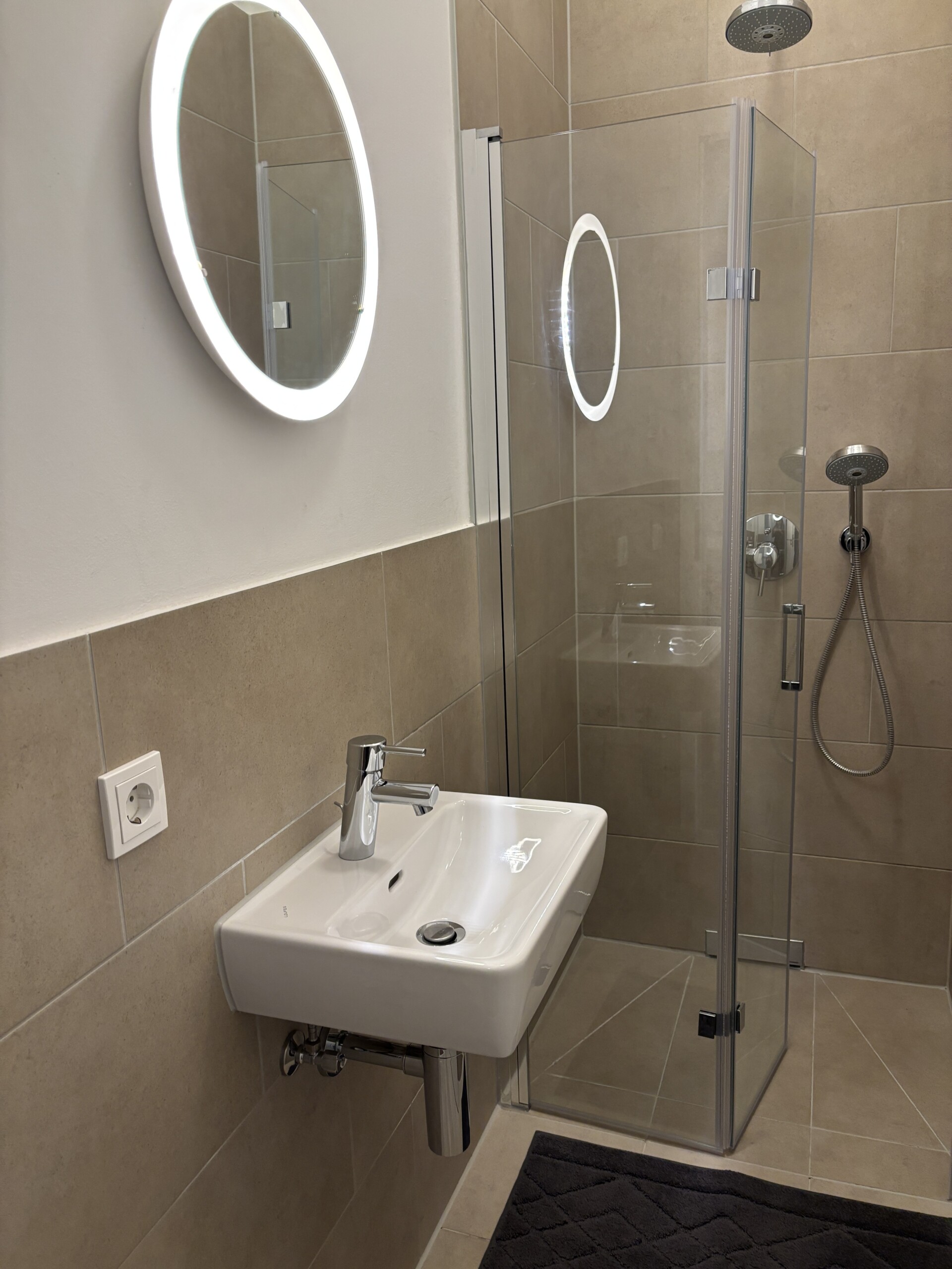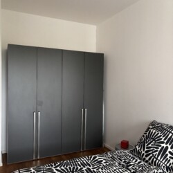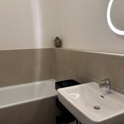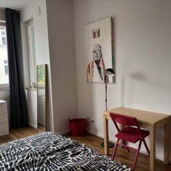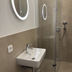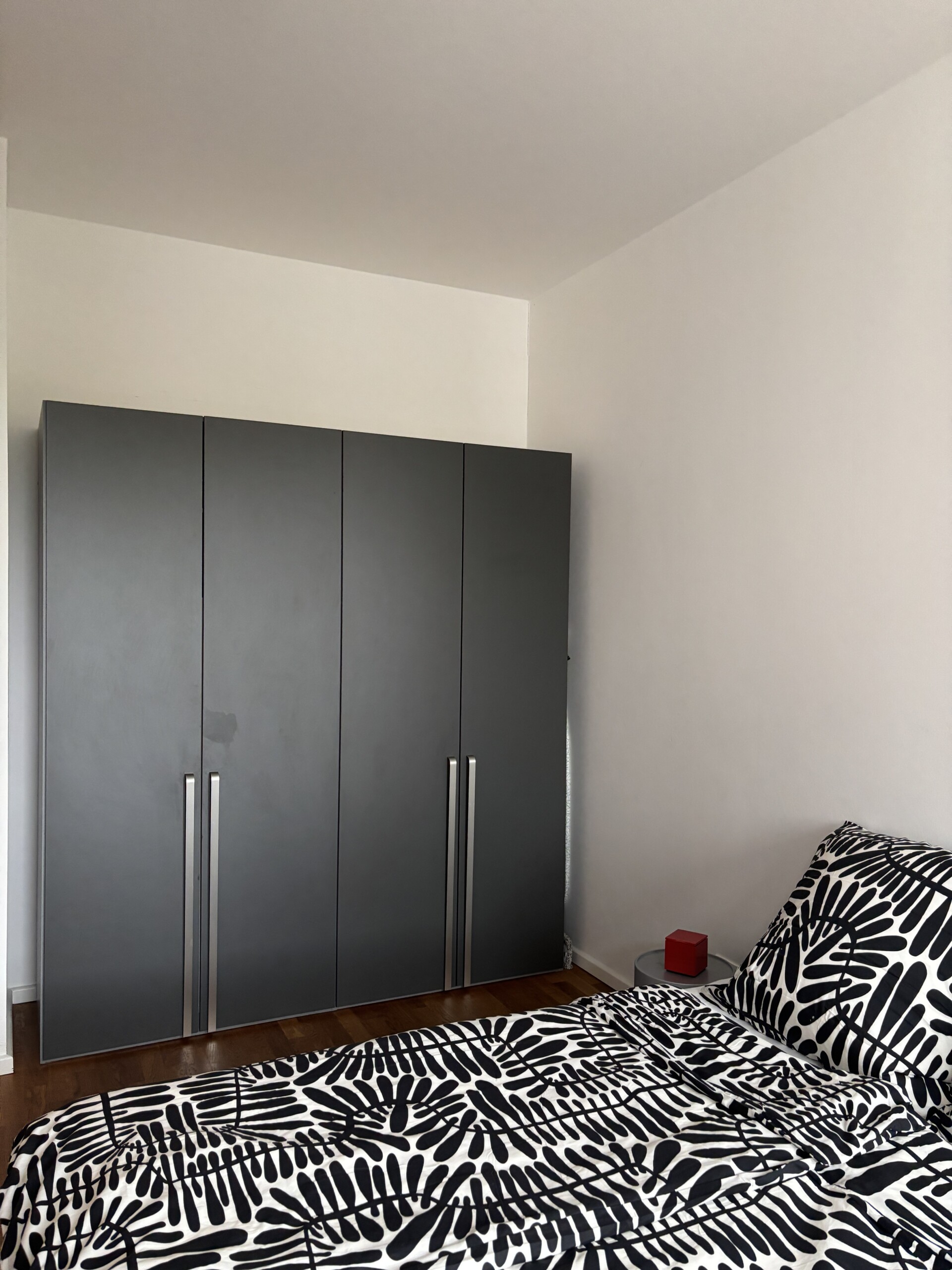 As you enter the charming grand Foyer of the modernised 60`s building assemble you can reach the Apartment by lift on the 3rd floor. The modern one bedroom apartment has a balcony with fantastic views including the TV tower. The living space combines perfectly with the fully equipped open plan kitchen. Beautifully decorated with attention to detail and large arty pictures on the walls. The custom made kitchen features modern appliances and built in cabinets with shiny surfaces. The sofa can be transferred into a bed and can comfortably fit two more persons. The bedroom features a queen size bed for a peaceful sleep including a large cupboards and great views from the windows. There are two bathrooms – one includes a bath tub and the second a walk-in rain shower. In the beautiful shared courtyard everybody is welcome to use the spacious children’s playground and a ping pong table for friends and kids.