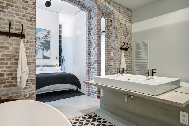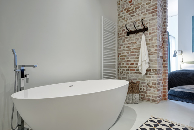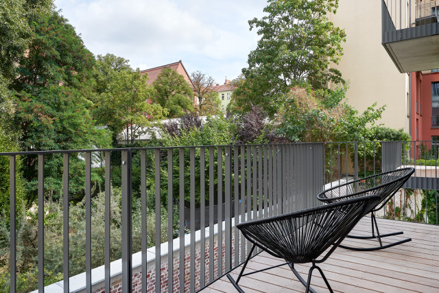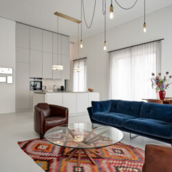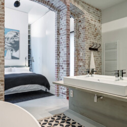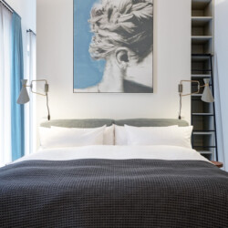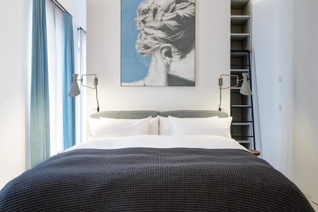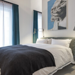 Sit in the lap of luxury with this gorgeous 100 sqm apartment with its smart floor plan. Located in the courtyard of a nice building, far from street noise, the apartment is exquisitely decorated with handpicked, high-end modern furnishings and features everything you will need for a comfortable urban living lifestyle. Everything is made with attention to detail. The contemporary kitchen has clean lines and a smart central island. The island has a hob and its raised counter area connects the kitchen space with the living room perfectly and makes every passionate chef want to cook for you. The master bedroom includes a comfortable king size bed for a peaceful sleep and is connected to the en-suite bathroom. Definetely another highlight is the bathroom with a free standing oval bath tub, a walk in shower and large sized square washbasin – live your private spa moments.